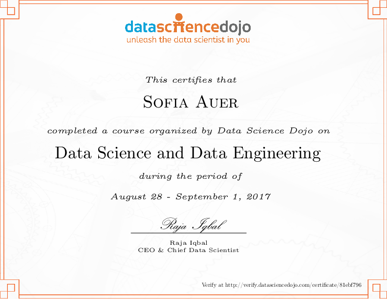 The existence of this website verifies that Sofia Auer has completed the Data Science and Data Engineering 5 DAY training. For additional details, email us.