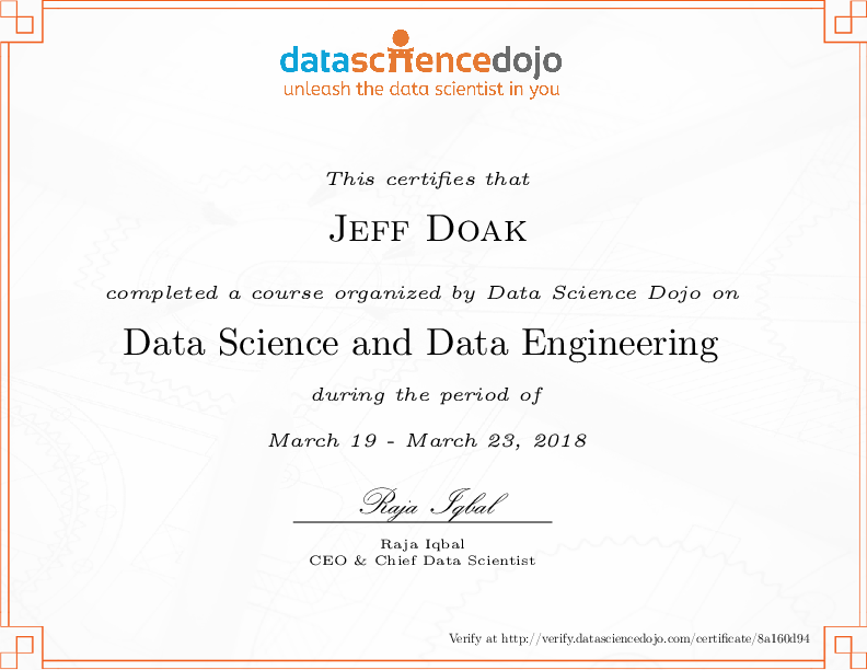 The existence of this website verifies that Jeff Doak has completed the Data Science and Data Engineering 5 DAY training. For additional details, email us.