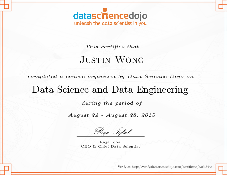 The existence of this website verifies that Justin Wong has completed the Data Science and Data Engineering 5 DAY training. For additional details, email us.