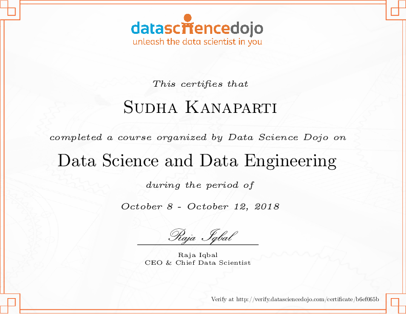 The existence of this website verifies that Sudha Kanaparti has completed the Data Science and Data Engineering 5 DAY training. For additional details, email us.