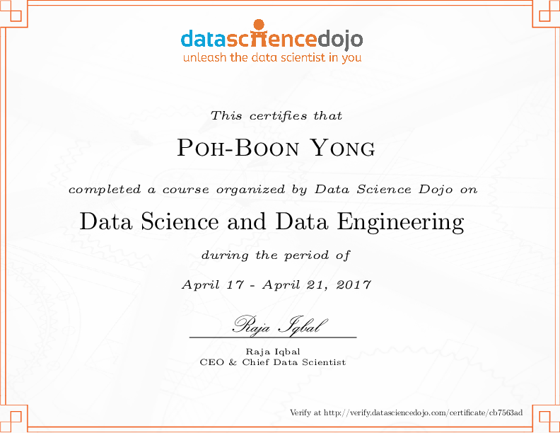 The existence of this website verifies that Poh-Boon Yong has completed the Data Science and Data Engineering 5 DAY training. For additional details, email us.