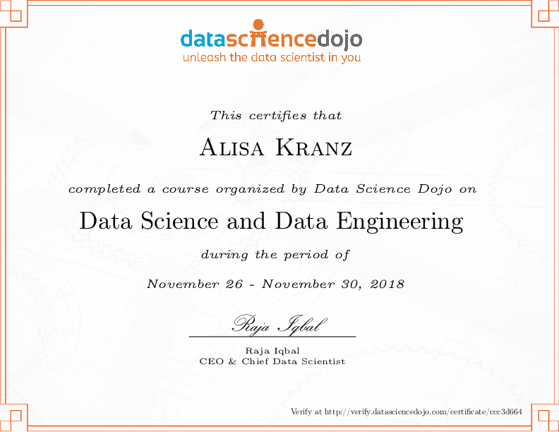 The existence of this website verifies that Alisa Kranz has completed the Data Science and Data Engineering 5 DAY training. For additional details, email us.