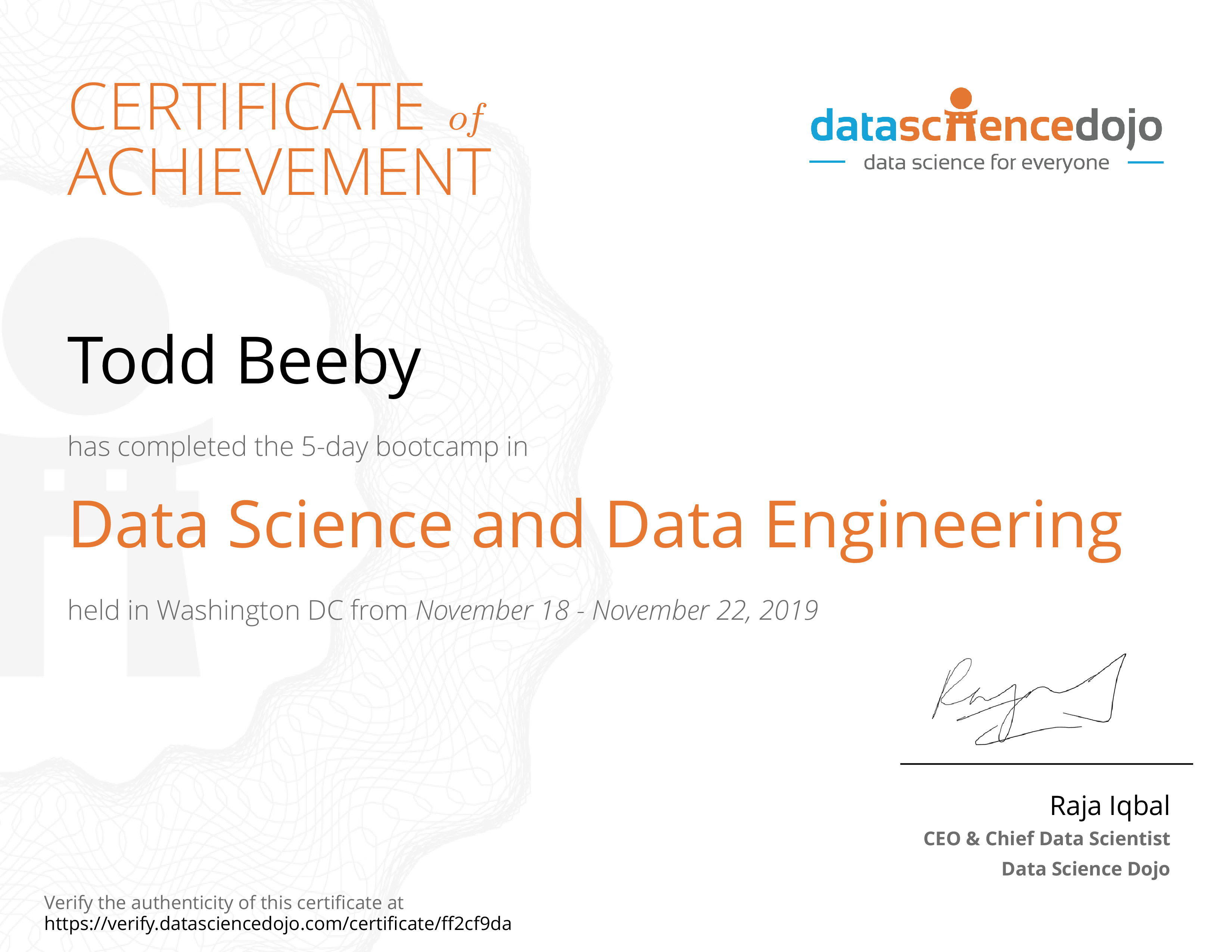 The existence of this website verifies that Todd Beeby has completed the Data Science and Data Engineering 5 DAY training. For additional details, email us.
