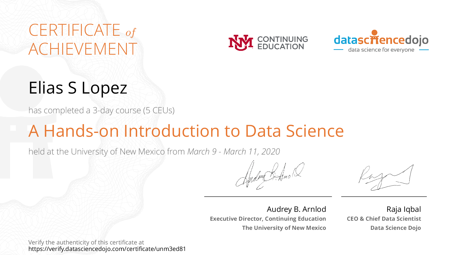 The existence of this website verifies that Elias S Lopez has completed the A Hands-on Introduction to Data Science training. For additional details, email us.